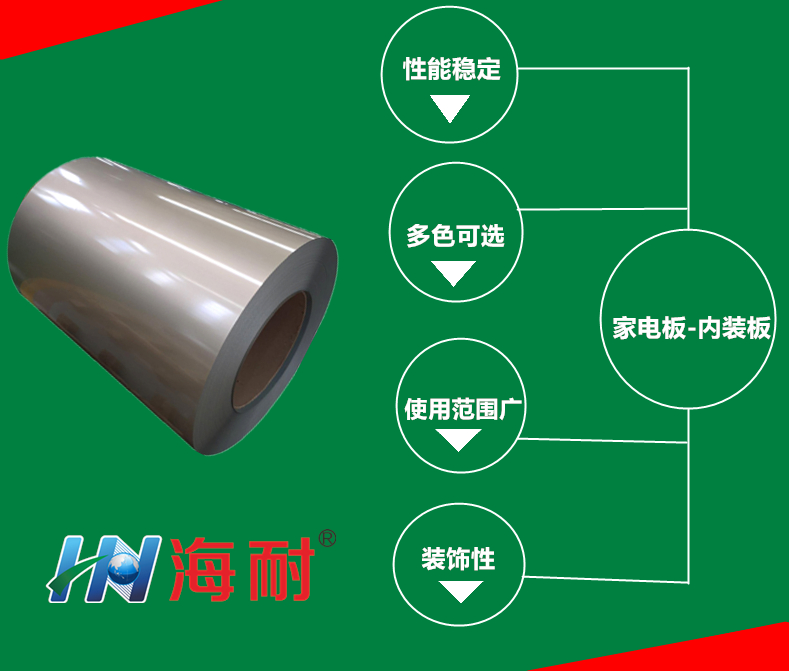 海耐彩鋼覆膜板是一種新式覆膜工藝,一層膜一層金屬板經過高溫、高壓合而成,用高光膜或幻彩膜、耐候膜、隔熱膜,經高分子膠膜熱壓覆合而成。海耐彩鋼覆膜板光澤鮮艷,可挑選花色品種多,除普通顏色外,珠光色、金屬色產品已成為家電外殼裝飾的流行趨勢(如銀色變頻冰箱、全頻冰箱以及居家小家電外殼均采用家電彩鋼板)。它防水、防火,具有優良的耐久性(耐候性、耐蝕性、耐化學性)和抗污能力,防紫外線性能優越。